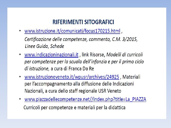 RIFERIMENTI NORMATIVI DPR n. 275/99: Regolamento per la disciplina dell'autonomia delle Istituzioni scolastiche, ai sensi dell'articolo 21 della legge n. 59 del 1997; • Legge 53/03: Legge delega per il riordino del sistema di istruzione e formazione; • C. M. 28/07: Introduzione della certificazione delle competenze al termine della scuola secondaria di primo grado; • D. L. 137/2008, conv. Legge 169/2008 sulla valutazione del comportamento e degli apprendimenti degli alunni; • DPR 122/2009: Regolamento sulla valutazione del comportamento e degli apprendimenti degli alunni, in att. della L. 169/08; • D. M. 254/2012 – Indicazioni Nazionali per il curricolo della scuola dell’infanzia e del primo ciclo di istruzione • C. M. 3/2015 ‐ Adozione sperimentale dei nuovi modelli nazionali di certificazione delle competenze nelle scuole del primo ciclo di istruzione. •