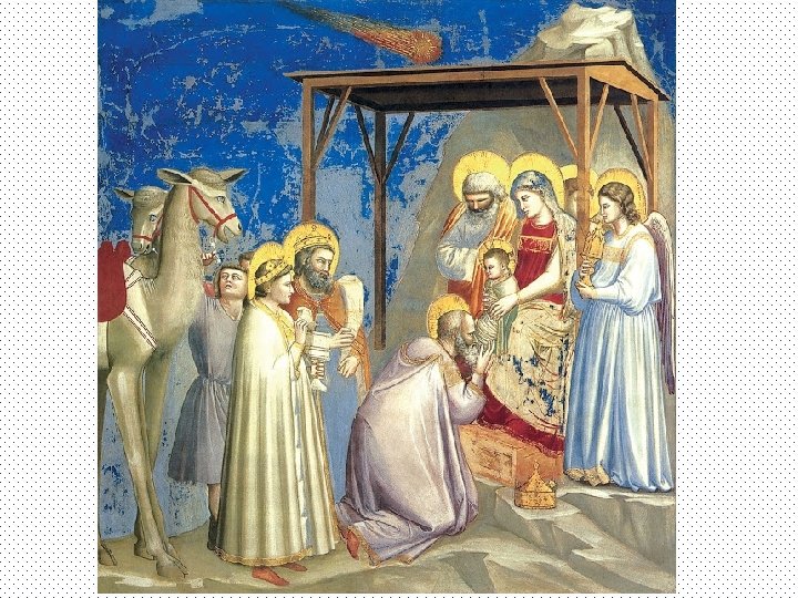 L’ADORAZIONE DEI MAGI di Giotto PRESUPPOSTI BIBLICI Gesù nacque a Betlemme di Giudea, al tempo del re Erode. Alcuni Magi giunsero da oriente a Gerusalemme e domandavano: «Dov’è il re dei Giudei che è nato? Abbiamo visto sorgere la sua stella, e siamo venuti per adorarlo» . All’udire queste parole, il re Erode restò turbato e con lui tutta Gerusalemme. Riuniti tutti i sommi sacerdoti e gli scribi del popolo, s’informava da loro sul luogo in cui doveva nascere il Messia. Gli risposero: «A Betlemme di Giudea, perché così è scritto per mezzo del profeta: E tu, Betlemme, terra di Giuda, non sei davvero il più piccolo capoluogo di Giuda: pascerà il mio popolo, Israele. Allora Erode, chiamati segretamente i Magi, si fece dire con esattezza da loro il tempo in cui era apparsa la stella e li inviò a Betlemme esortandoli: «Andate e informatevi accuratamente del bambino e, quando l'avrete trovato, fatemelo sapere, perché anch’io venga ad adorarlo» . Udite le parole del re, essi partirono. Ed ecco la stella, che avevano visto nel suo sorgere, li precedeva, finché giunse e si fermò sopra il luogo dove si trovava il bambino. Al vedere la stella, essi provarono una grandissima gioia. Entrati nella casa, videro il bambino con Maria sua madre, e prostratisi lo adorarono. Poi aprirono i loro scrigni e gli offrirono in dono oro, incenso e mirra. Avvertiti poi in sogno di non tornare da Erode, per un’altra strada fecero ritorno al loro paese. Matteo 2, 1 -12