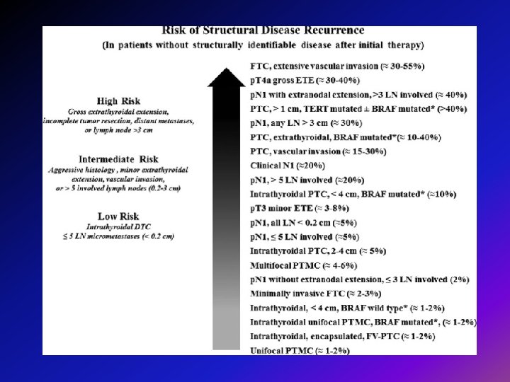 I TUMORI DELLA TIROIDE Variabili influenzanti la recidiva e la mortalità FATTORI PREDITTIVI DI BASSO RISCHIO – – Età 15 -55 aa Sesso femminile Anamnesi familiare negativa per ca tiroideo T 1 -T 2 N 0 M 0 Vengono considerati a bassissimo rischio gli incidentalomi papillari di pochi mm completamente escissi, in assenza di precedente irradiazione al collo, familiarità per ca tiroideo, noduli nel lobo controlaterale, linfonodi
