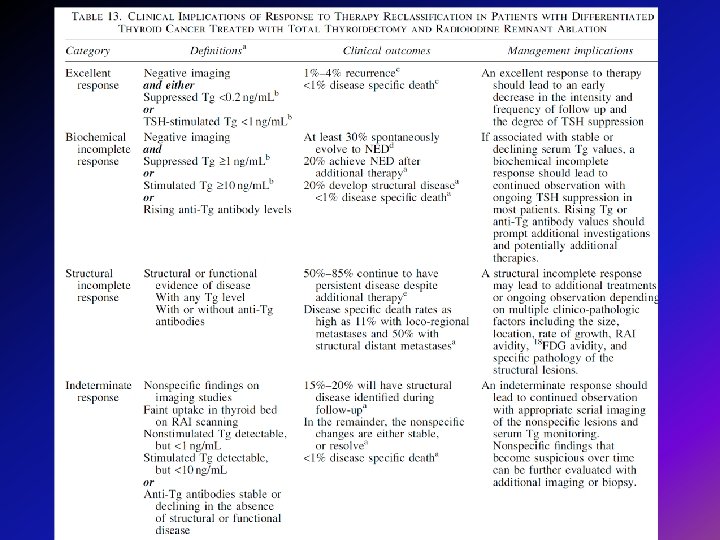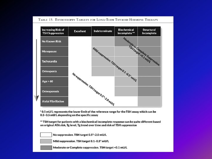 Follow-up TSH ricombinante (rh. TSH) E’ ottenuto con tecnica ricombinante; la sua sequenza aminoacidica è identica a quella del TSH ipofisario umano Il legame tra rh. TSH e i recettori del TSH su cellule tiroidee normali o neoplastiche stimola la captazione e l’organificazione dello iodio, la sintesi e la secrezione di Tg. La somministrazione di rh. TSH permette di eseguire un WBS e il dosaggio della Tg con ottima sensibilità evitando i sintomi dell’ipotiroidismo