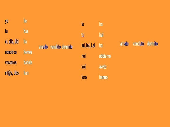 ¿ Come si forma il pretèrito perfecto? El pretérito perfecto está formado por la combinación del verbo HABER y el participio del verbo principal. amar vender dormir yo he tu has el, ella, Ud ha nosotros hemos vosotros habèis ell@s, Uds. han ado ido amado vendido dormido