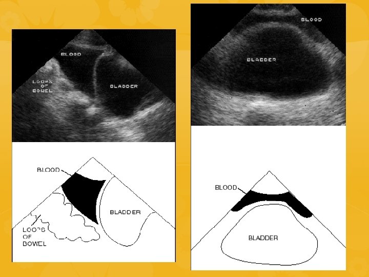Finestra soprapubica • • • Intera pelvi esplorabile iniziando con la sonda in posizione trasversa dal fondo e poi in posizione sagittale Scavo del Douglas: porzione più declive della cavità peritoneale Primo segno di presenza di sangue libero: 2 piccoli triangoli ai due lati del retto