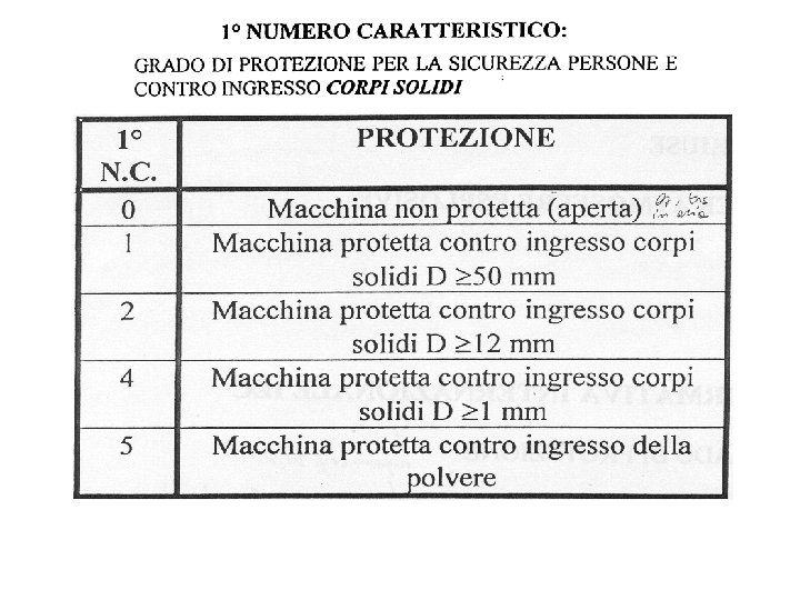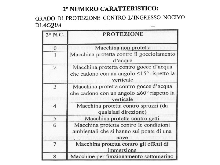 MACCHINE PROTETTE: è costruita in modo da impedire l’accesso a parti interne, senza ostacolare il passaggio di aria di raffreddamento fra l’esterno e l’interno Protetta Contro Corpi Solidi: impedire la penetrazione di corpi solidi di diametro maggiore rispettivamente a 50 -3 -1 mm. (grossi, medi, piccoli) Protetta Contro lo Stillicidio: impedire che le gocce liquide o particelle solide, cadenti sulla macchina con un angolo non maggiore di 15° rispetto alla verticale, non possano raggiungere le parti attive interne, né direttamente, né indirettamente scivolando lungo le superfici inclinate