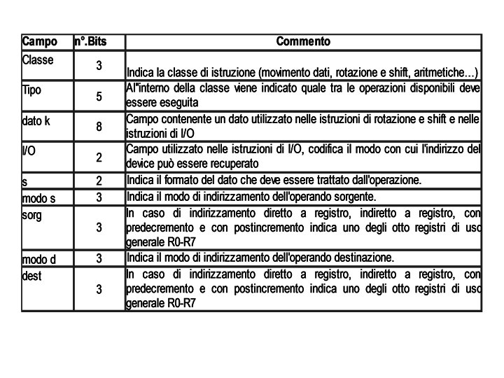 Set Istruzioni • Sono organizzate in 8 classi (3 bit codice operativo specificano la classe) – – – – Movimento dati Aritmetiche (somma e sottrazione) Tipo Logico Rotazione e shift Operazioni sui bit di stato controllo del programma controllo della macchina ingresso/uscita