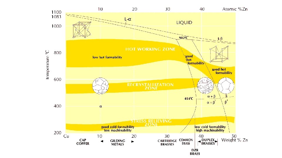 Per tenori di Zn = 37 - 47% si ha la graduale comparsa della fase (CCC). La fase puo' esistere, a seconda della temperatura (450 C), in uno stato “ordinato” (sotto 450 C - ') o “disordinato” (sopra 450 - ). Nello stato ordinato, gli atomi di zinco sono disposti entro il reticolo secondo una successione regolare, appunto "ordinata", con un reticolo c. con gli ioni di Zn ai vertici e con lo ione di Cu al centro. La struttura ordinata e' assai dura e si presta soltanto a modeste deformazioni plastiche, mentre la struttura disordinata e' estremamente plastica e duttile. Gli ottoni ( ), quindi, sono essenzialmente delle leghe da deformazione plastica a caldo. Inoltre, con questi tenori di Zn, in fase di riscaldamento parte della fase si trasforma in . Ottoni : la lega piu'rappresentativa e' la lega MUNTZ (Cu Zn 40) assai plastica a T>750 C ma non a freddo L’ uso e' quindi limitato a manufatti che subiscono quasi tutta la loro lavorazione plastica a caldo (es. piastre tubiere di grande spessore finite a caldo, barre estruse a caldo e solo raddrizzate a freddo).