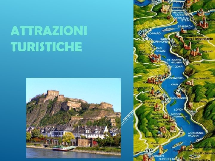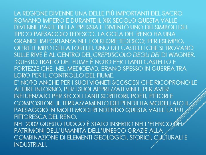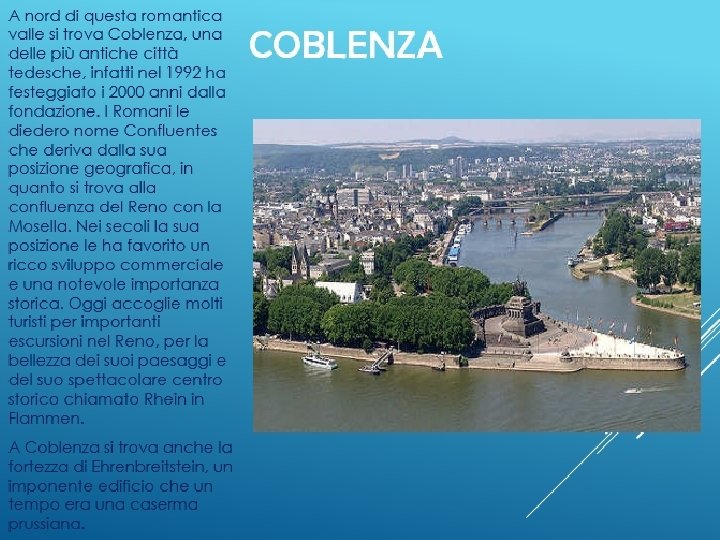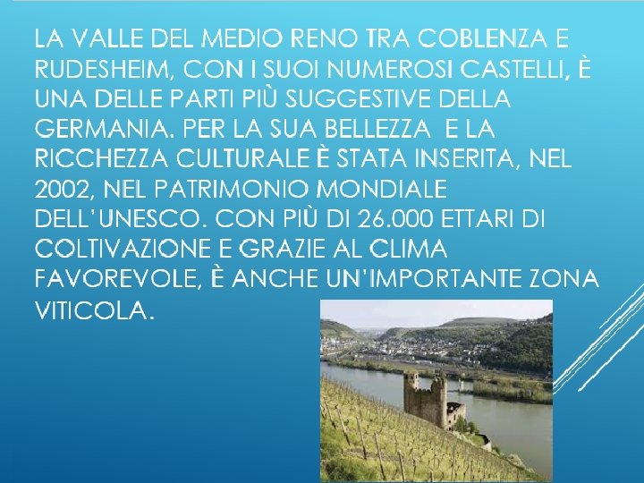 UN PO’ DI STORIA Le prime tracce di popolamenti umani nell’area del Reno risalgono ad oltre 100. 000 anni fa. Gli abitanti delle due rive del Reno furono in origine probabilmente Celti, ma nel I secolo avanti Cristo entrambe le sponde erano già occupate da tribù germaniche. I Romani comprese per primi l’importanza strategica del Reno quale barriera difensiva della Gallia e dello stesso Stato Romano e perciò ne occuparono entrambe le rive. Dal IV secolo dopo Cristo il Reno costituì un formidabile confine militare, supportato da una vasta rete stradale Nel Medioevo la Valle del Reno divenne il cuore dell’Impero non solo geograficamente, ma anche spiritualmente, perché lungo le sue sponde ebbero la loro sede gli Arcivescovi di Magonza, Colonia e Treviri. La navigabilità del fiume favorì il commercio, incrementando lo sviluppo e la fioritura di molte città