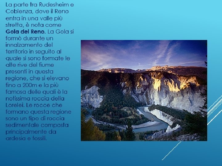 PAESAGGI Lungo tutto il suo percorso il Reno attraversa tre paesaggi: • a sud, le Alpi • verso nord, rilievi più antichi, oggi ridotti a colline, dette Mittelgebirge Cioè montagne medie) e il Massiccio Scistoso Renano; • a nord, l’ampia pianura