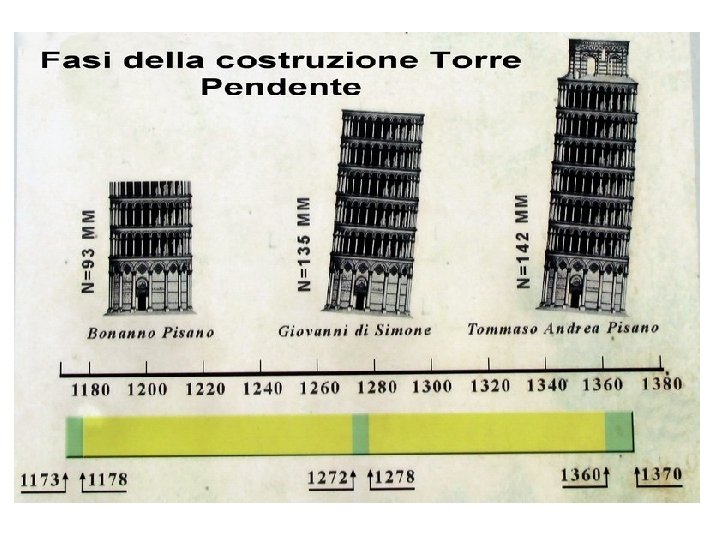 LA COSTRUZIONE • Prima fase: 1173 (anno 1174, secondo il calendario pisano). • Gherardi di Gherardi o Bonanno Pisano. • Interrotta a metà del terzo piano • Seconda fase: Giovanni di Simone e Giovanni Pisano (aggiunta di altri 3 piani) • Tommaso e Andrea Pisano: il campanile viene completato (metà XIV sec. ), aggiungendo la cella campanaria.