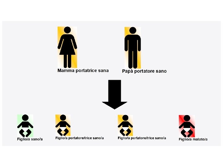TRASMISSIONE EREDITARIA Possono verificarsi due casi: 1) uno soltanto dei genitori è microcitemico, mentre l'altro è normale. In tal caso, circa la metà dei figli eredita un gene normale e uno microcitemico (essi saranno perciò dei "portatori sani" della malattia); l'altra metà eredita due geni normali e i figli saranno del tutto normali. Non ci sono possibilità di generare figli ammalati della forma grave di talassemia. 2) Tutti e due i genitori sono microcitemici. Negli eventuali figli che nasceranno si avranno le seguenti probabilità (teoriche): a) 25% - individui sani b) 50% - individui affetti da beta-talassemia minor (forma eterozigote di microcitemia) c) 25% - individui ammalati gravi, con beta-talassemia major (forma omozigote).
