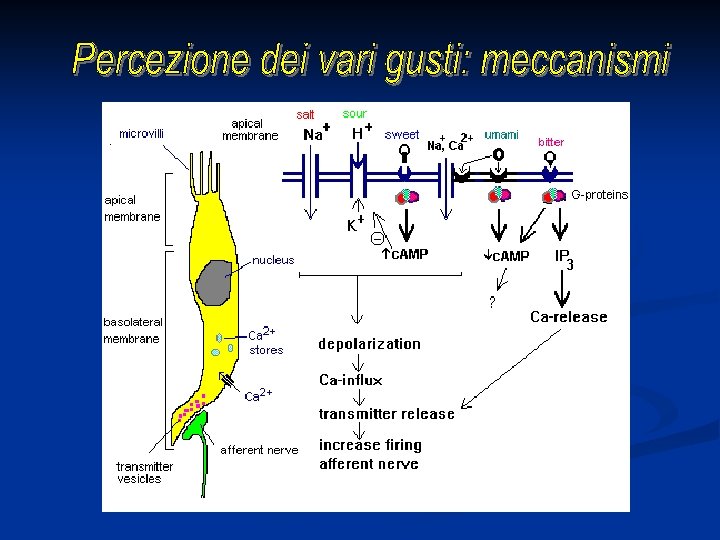Meccanismo diretto Salt taste Salt is sodium chloride (Na. Cl). Na+ ions enter the receptor cells via Na-channels. These are amiloride-sensitive Na+ channel. The entry of Na+ causes a depolarization, Ca 2+ enters through voltagesensitive Ca 2+ channels, transmitter release occurs and results in increased firing in the primary afferent nerve.