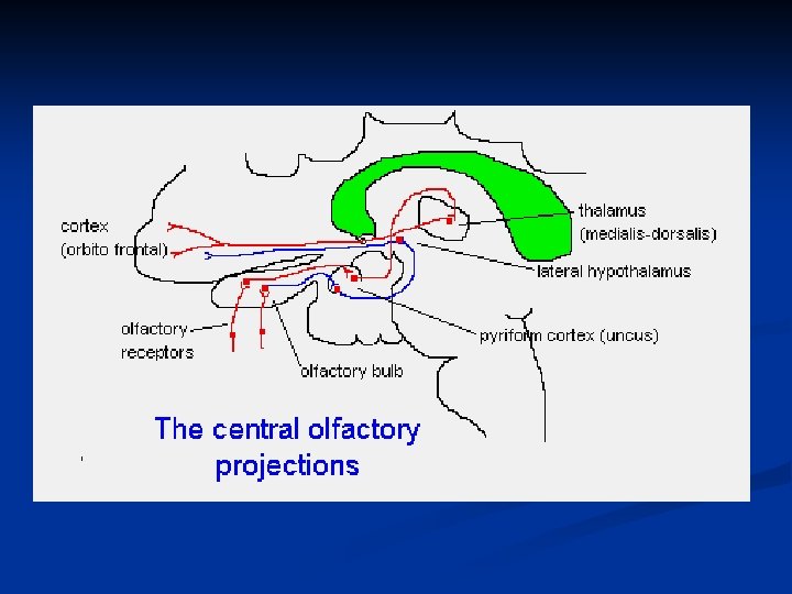 Neurons from the lateral olfactory tract project to; (1) the amygdala, septal nuclei, pre-pyriform cortex, the entorhinal cortex, hippocampus and the subiculum. Many of these structures form the limbic system, an ancient region of the brain concerned with motivation, emotion and certain kinds of memory. The septal nuclei and amygdala contain regions known as the "pleasure centres". The hippocampus is concerned with motivational memory (the association of certain stimuli with food). (2) Projections are also sent to the thalamus and thence to the frontal cortex for recognition. There are many forward and backward connections between each of these brain centers.