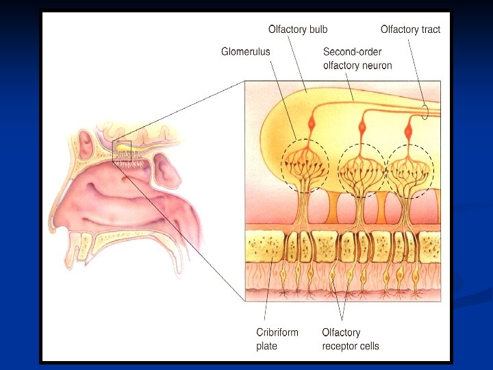 Dalla porzione basale dei neuroni olfattivi si dipartono gli assoni che si riuniscono in fasci di 10 -100, passano attraverso la lamina cribrosa dell’osso etmoide e raggiungono il bulbo olfattivo convergendo sui glomeruli olfattivi. I neuroni che esprimono lo stesso tipo di recettore convergono sullo stesso glomerulo. Per quanto riguarda i recettori se ne conoscono circa 350 codificati da altrettanti geni. Nel genoma umano esistono circa 1000 geni differenti potenzialmente in grado di codificare per altrettanti recettori. Questi recettori appartengono alla famiglia dei recettori con 7 domini transmembrana, accoppiati a proteine G.