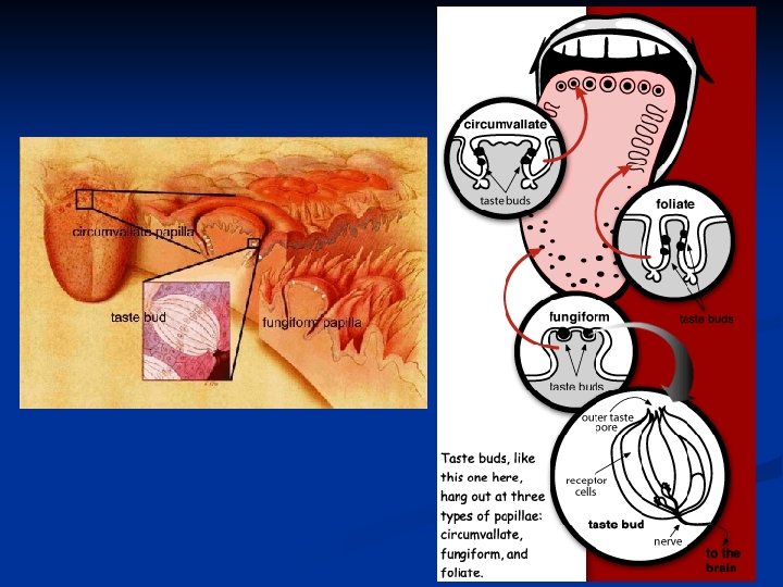 Le papille sono visibili sulla superficie della lingua come puntini rossi specialmente sulla punta. Quelle frontali sono dette papille fungiformi. Oltre a queste troviamo le papille fogliate e quelle circumvallate che sono le più grandi, sul V linguale. Le gemme gustative invece non sono visibili ad occhio nudo e sono formate da diversi tipi cellulari: