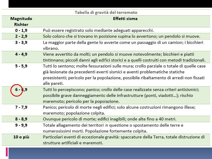 La scala Richter Con l'attribuzione di un valore sulla scala Richter, si esprime una misura della cosiddetta magnitudo, ovvero una stima dell'energia sprigionata da un terremoto nel punto della frattura della crosta terrestre, cioè all'ipocentro Si ricava dalla misura in micron dell’oscillazione provocata dalle onde p ricevute dal sismografo rilevabili sul sismogramma è l’esponente di base 10 che esprime in micron l’oscillazione del pennino sul sismogramma (Logaritmo) Non dipende dal luogo del sisma