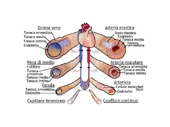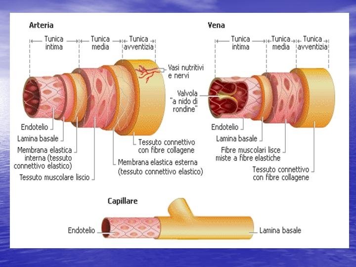 I VASI. La loro struttura non è omogenea e la differenziazione funzionale dipende dalla struttura. Sono elementi costitutivi comuni della parete dei vasi: l'endotelio, con la sua membrana basale; la media, contenente fibre muscolari liscie, fibre elastiche e fibre collagene in diverse proporzioni; l'avventizia, contenente tessuto connettivo lasso, terminazioni nervose (simpatiche) e vasi (vasa vasorum).