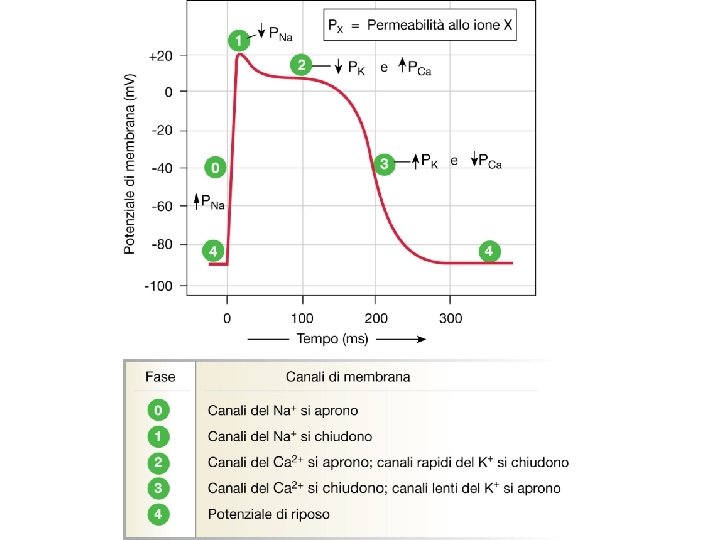 2 - plateau: potenziale stabile su valori leggermente positivi per circa 0. 2 s; dovuto all'aumento della conduttanza al calcio (apertura di "canali lenti") e riduzione della conduttanza al potassio 3 - ripolarizzazione per progressivo aumento della conduttanza al potassio e chiusura dei canali lenti; 4 - potenziale di riposo, stabile a -90 m. V.