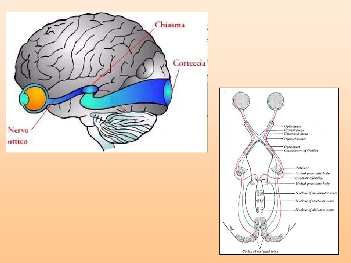I Recettori sensoriali e l’avvio degli impulsi nervosi 1. Percezione da parte dei recettori di stimoli di natura chimica, fisica, meccanica 2. Induzione dell’alterazione della permeabilità di membrana di un neurone sensoriale 3. Innesco e trasporto dell’impulso nervoso in senso centripeto Il segnale per ogni sensazione è ugualmente codificato e trasmesso, ma diversa è l’area cerebrale verso cui sono diretti. Corteccia sensoriale per stimoli relativi al gusto, tatto, temperatura, dolore Per il senso della vista e dell’udito, più evoluti e sofisticati si sono evolute due aree specifiche.