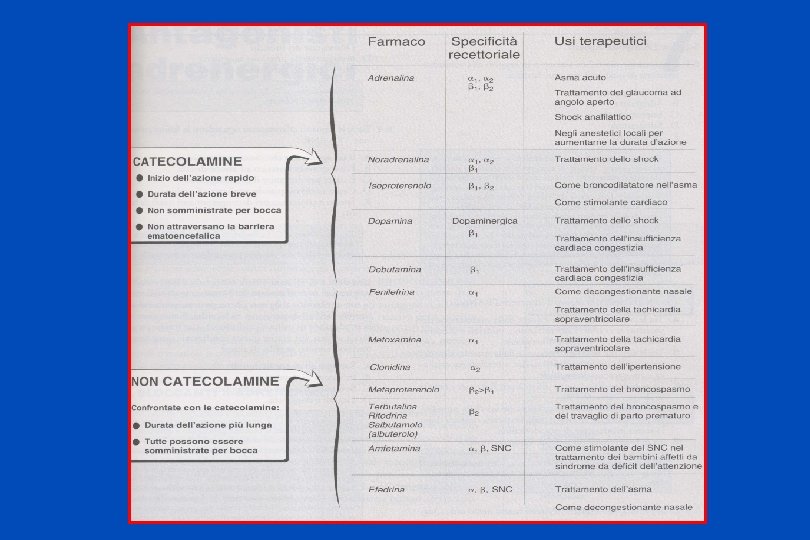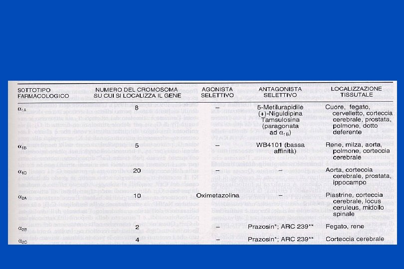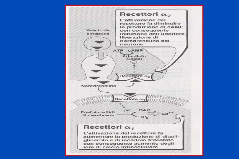 LOCALIZZAZIONE DEI PRINCIPALI RECETTORI ADRENERGICI ALFA 1: muscoli lisci dei vasi muscolo dilatatore pupillare fegato cuore ALFA 2: recett. postsinaptici nel. SNC piastrine autocettori nel SNC alcuni muscoli lisci vasali cellule adipose BETA 1: cuore BETA 2: muscoli lisci apparato respiratorio dell’utero dei vasi muscolo scheletrico fegato BETA 3: cellule adipose D 1: muscolatura liscia D 2: terminazioni nervose