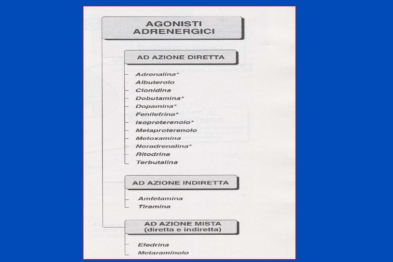 FARMACI SIMPATICOMIMETICI 1. AD AZIONE DIRETTA (AGISCONO SUI RECETTORI ADRENERGICI) 2. AD AZIONE INDIRETTA (AGISCONO SULLA LIBERAZIONE DEI NEUROTRASMETTITORI) 3. AD AZIONE MISTA