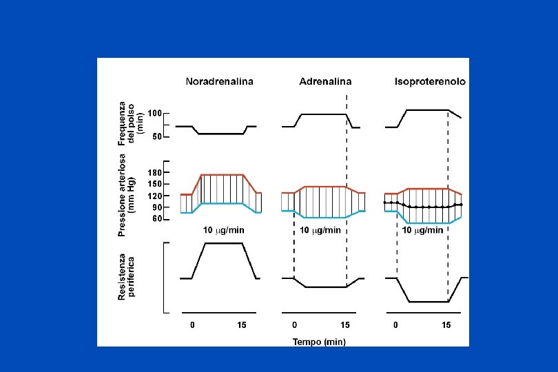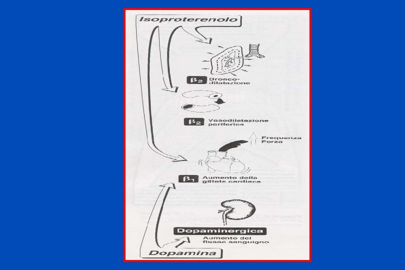 NORADRENALINA Agente vasopressorio con azioni inotropa e cronotropa positive sul cuore (beta 1) MA CON SCARSO EFFETTO SUI beta 2 Di conseguenza fa aumentare le resistenze periferiche e la pressione sia Diastolica che sistolica. ISOPROTERENOLO Potente agonista dei recettori beta, con scarsi effetti sugli alfa Effetti cronotropi ed inotropi positivi e riduzione della pressione diastolica e lieve riduzione (o aumento) di quella sistolica