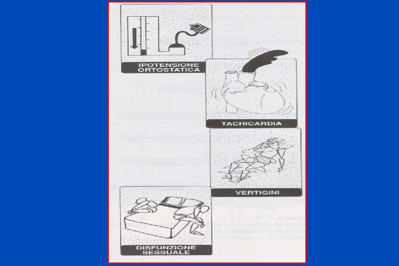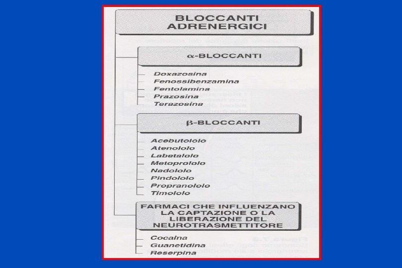 PRAZOSINA, TERAZOSINA, DOXAZOSINA Antagonisti competitivi alfa 1 e non alfa 2 Effetto antiipertensivo Rilasciano sia la muscolatura liscia venosa che arteriosa Minime modificazioni della gittata cardiaca, del flusso renale e della velocità di filtrazione glomerulare (rispetto alla fenossibenzamina) La prima dose può causare sincope (si dimezza la dose) USI TERAPEUTICI: nell’ipertensione e nell’ipertrofia prostatica benigna insieme alla TAMSULOSINA perché migliorano il flusso urinario per rilasciamento della muscolatura del collo della vescica