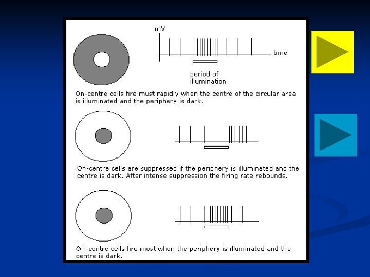 Questa viene definita cellula bipolare a centro ON. L’opposto di questo scenario può essere creato invertendo tutti i segnali con il risultato di avere una cellula a centro OFF. Questa peculiarità di centro ON / OFF è anche una caratteristica dei neuroni del nucleo genicolato laterale talamico. Le cose divengono ancora più complesse a livello corticale.
