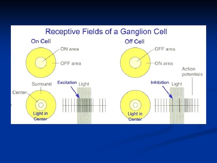 A livello foveale addirittura si ha un rapporto 1: 1 fra coni e gangliari e la massima acuità visiva. Bisogna ricordare che le cellule gangliari trasmettono i segnali attraverso il nervo ottico mediante potenziali d’azione. Anche le cellule gangliari sono soggette a un meccanismo a centro ON o OFF e questo è particolarmente importante nella percezione dei contrasti.