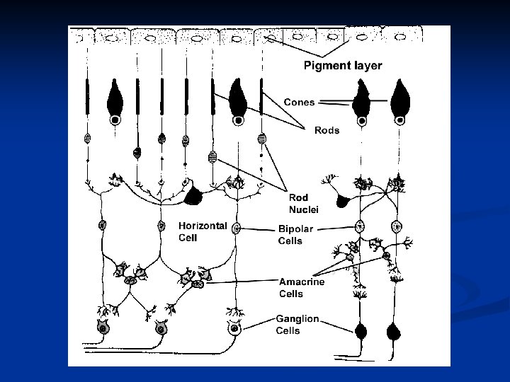 Le principali cellule e connessioni nervose che troviamo nella retina sono: Fotorecettori: coni e bastoncelli che sono in contatto con cellule orizzontali o cellule bipolari. Cellule orizzontali: trasmettono segnali orizzontalmente nello strato plessiforme esterno dai bastoncelli e coni ai dendriti delle cellule bipolari