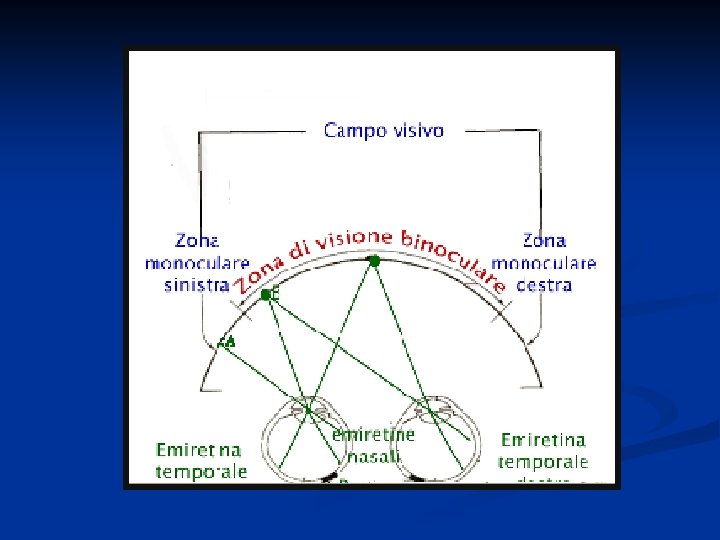 Fibre visive si dirigono anche ad aree encefaliche più antiche. Dai tratti ottici: § al nucleo soprachiasmatico dell’ipotalamo § ai nuclei pretettali per il riflesso pupillare e la fissazione degli occhi § al collicolo superiore del mesencefalo per i movimenti simultanei due occhi § al nucleo genicolato ventrale per partecipare al controllo delle funzioni comportamentali legate alla visione.