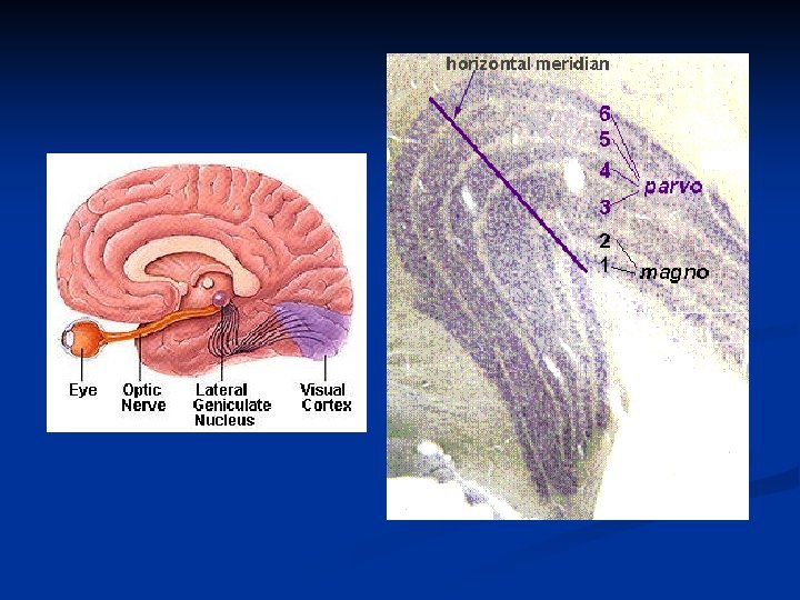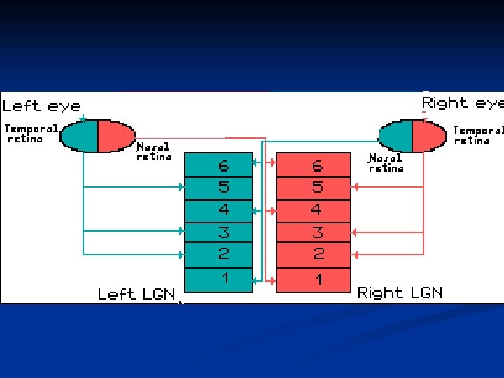 Nucleo genicolato laterale Il n. g. l. è formato da 6 strati di neuroni organizzati in maniera molto precisa. In primo luogo, le cellule dello stesso strato nella parte di dx e nella parte di sx hanno campi recettivi nella stessa area della retina. Inoltre le fibre provenienti dai due occhi sono segregati in strati diversi. Le fibre ipsilaterali arrivano negli strati 2, 3, 5, mentre le fibre controlaterali agli strati 1, 4, 6.