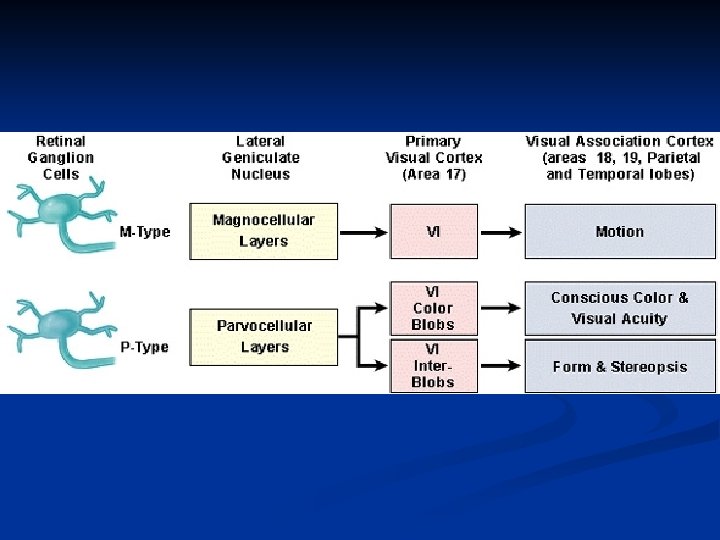 Esistono almeno 18 tipi diversi di cellule gangliari nella retina umana. Fra queste due classi sono tipiche dei primati e sono implicate nell’elevata acuità visiva e nella percezione dei colori. Si tratta delle cellule gangliari P e M che proiettano rispettivamente ai neuroni parvocellulari e magnocellulari del nucleo genicolato laterale del talamo.