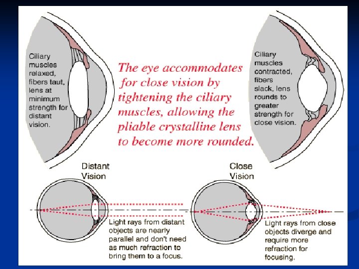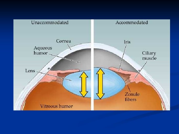 Non accomodato: muscolo ciliare rilasciato legamenti sospensori tesi cristallino appiattito minimo potere diottrico visione a distanza Accomodato: muscolo ciliare contratto legamenti sospensori rilasciati cristallino arrotondato max potere diottrico visione vicino