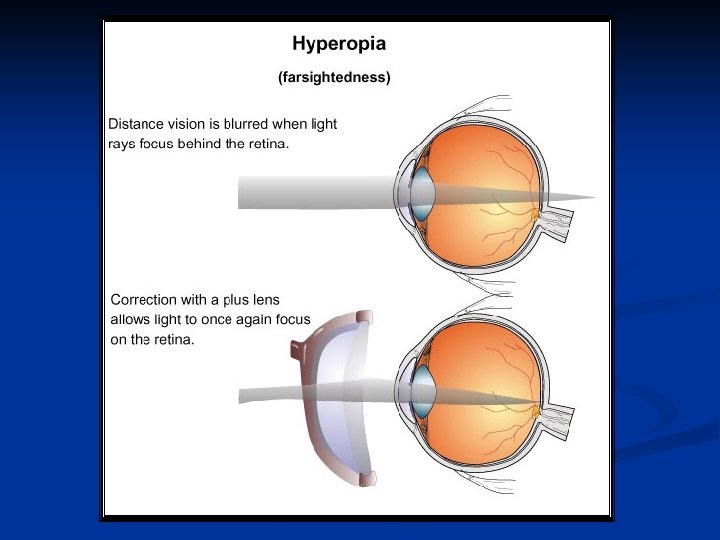 Ipermetropia: il sistema diottrico dell’occhio non riesce a mettere a fuoco gli oggetti lontani senza accomodazione. Quando l’oggetto si avvicina molto il sistema di accomodazione è saturato e non riesce a compensare ulteriormente. Può dipendere sia da una debolezza del sistema diottrico, sia da un asse antero-posteriore dell’occhio troppo corto.