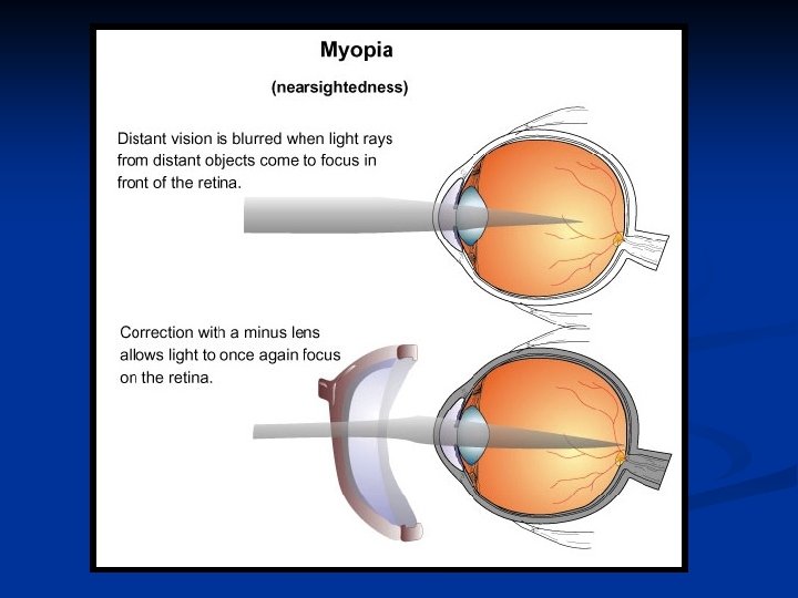 Miopia: in questo caso anche quando il cristallino è completamente appiattito, l’occhio non riesce a mettere a fuoco gli oggetti lontani. Il potere diottrico non può scendere al di sotto del valore minimo, cioè di quando il muscolo ciliare è completamente rilasciato. In genere la miopia dipende da una lunghezza eccessiva dell’asse antero-posteriore Miope Normale dell’occhio.