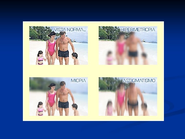 Astigmatismo: è un difetto di rifrazione dovuto al fatto che il cristallino o più frequentemente la cornea esercitano un potere diottrico differente a seconda del piano considerato. Risultano distorti gli oggetti vicini e quelli lontani. L’accomodazione non funziona perché la curvatura del cristallino varia in ugual misura sui due piani.