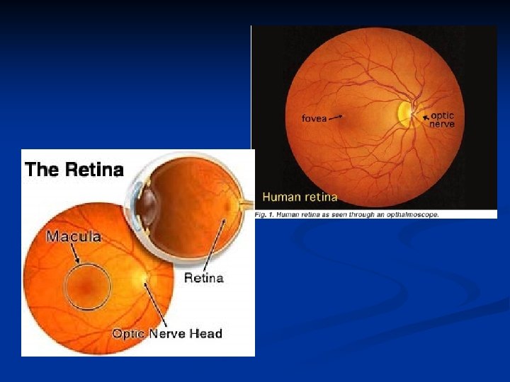 I coni e i bastoncelli sono quindi i fotorecettori e, una volta eccitati, questi veicolano l’informazione ad una serie di neuroni che vedremo e da questi al nervo ottico fino alla corteccia cerebrale. La retina è una sottile membrana di colore rosso-arancio dal cui centro si diparte il nervo ottico. A livello del nervo ottico partono i vasi sanguigni principali della retina, l’arteria e la vena centrale della retina, mentre, esattamente al centro della retina, si trova una piccola area di forma ovale, di colore rossastro e priva di vasi sanguigni detta fovea. La parte di retina che comprende la fovea e si estende con un diametro di 3 mm rispetto ad essa è chiamata macula.