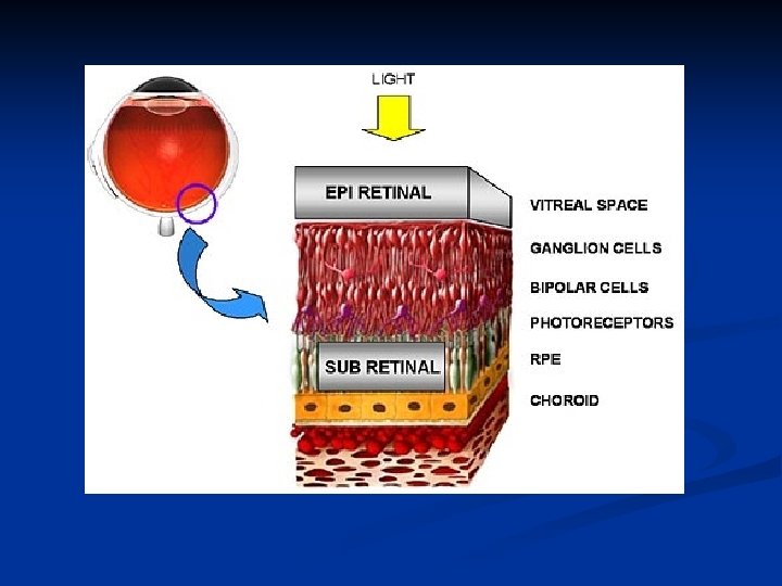 La zona subito attorno alla fovea è chiamata retina centrale mentre la parte ad essa esterna è indicata come retina periferica. In totale la retina è un disco circolare con un diametro di circa 42 mm che finisce in corrispondenza del margine pupillare dell’iride. Vediamo adesso gli strati della retina.
