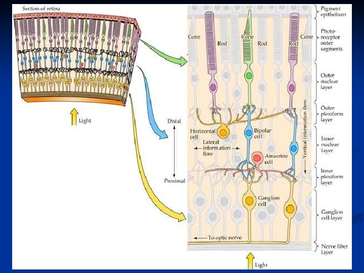 Nella retina, così come per altri sistemi sensoriali, esistono due sistemi visivi di cui uno legato ai bastoncelli, filogeneticamente più antico e uno legato ai coni, più recente. Le fibre nervose che conducono segnali legati ai coni sono vie più grosse e a maggior velocità di conduzione. Le connessioni retiniche sono riportate schematicamente di seguito.