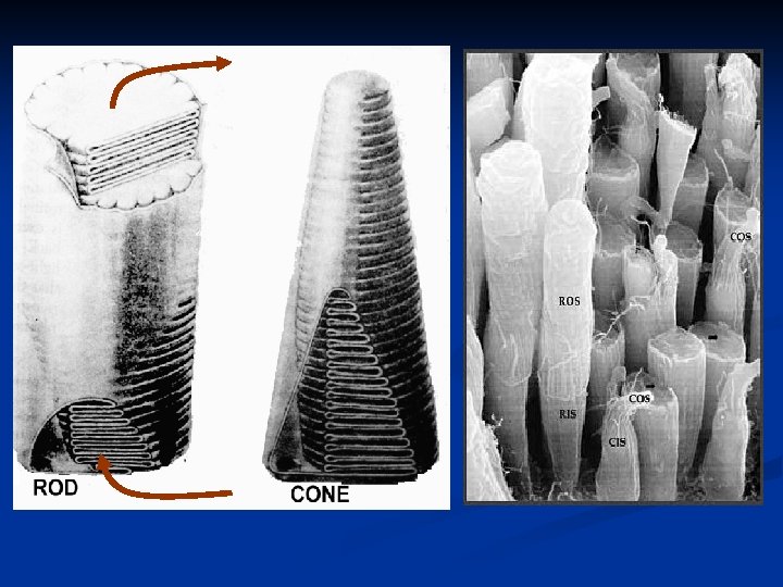 I coni (6 -7 milioni) e i bastoncelli (120 milioni) sono i trasduttori della luce. Sono cellule altamente specializzate caratterizzate da strutture molto particolari per espletare il loro compito. Sono strutturalmente molto simili e si compongono di: segmento esterno: dischi che portano il pigmento visivo soma: con nucleo, mitocondri, reticolo endoplasmico, Golgi etc. segmento interno: terminale sinaptico in contatto con le cellule bipolari.