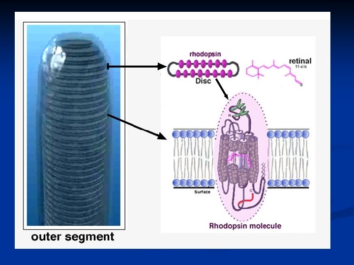 La parte più caratteristica dei fotorecettori è sicuramente il segmento esterno. In entrambi i casi troviamo una serie di dischi impaccati che derivano dalla membrana esterna del fotorecettore e che, nel caso dei bastoncelli, si distaccano completamente restando isolati a formare una pila di dischi, mentre nel caso dei coni mantengono connessione con la membrana esterna. Questi dischi sono soggetti ad un rapido turnover. Quelli più vecchi sono eliminati all’apice del fotorecettore, mentre quelli più nuovi derivano dalla parte a contatto con il soma.