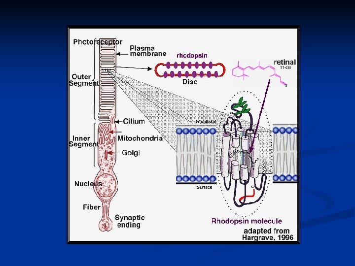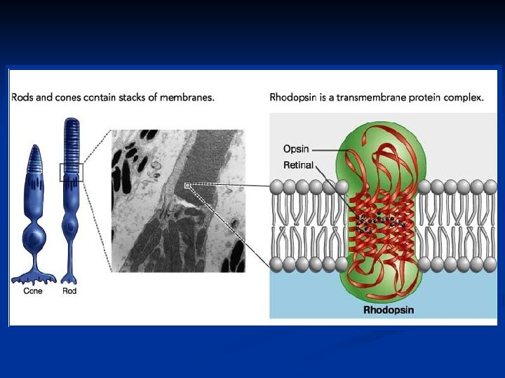 Il pigmento visivo dei bastoncelli prende il nome di rodopsina. Nei coni esistono tre diversi tipi di pigmenti visivi che hanno caratteristiche simili alla rodopsina, ma una diversa sensibilità per le radiazioni dello spettro. La rodopsina è formata da: una parte proteica detta opsina un gruppo cromoforo detto retinale (aldeide della vitamina A) nella conformazione 11 -cis al buio e all-trans sotto stimolazione luminosa.