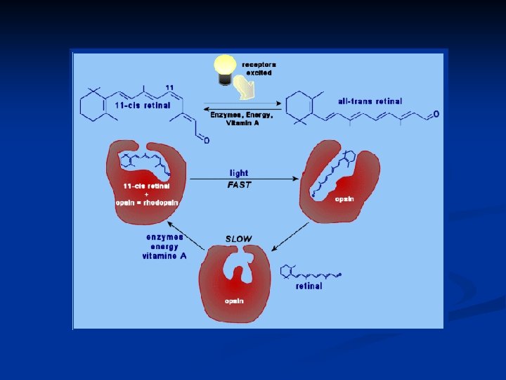 Questo ha come conseguenza immediata il fatto che l’opsina perde affinità per il retinale, perché si viene a creare una sorta di ingombro sterico. La rodopsina passa RAPIDISSIMAMENTE attraverso una serie di intermedi altamente instabili, che sono: prelumirodopsina o batorodopsina lumirodopsina metarodopsina II: è la forma attiva del recettore che determina variazioni elettriche nel fotorecettore