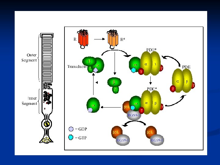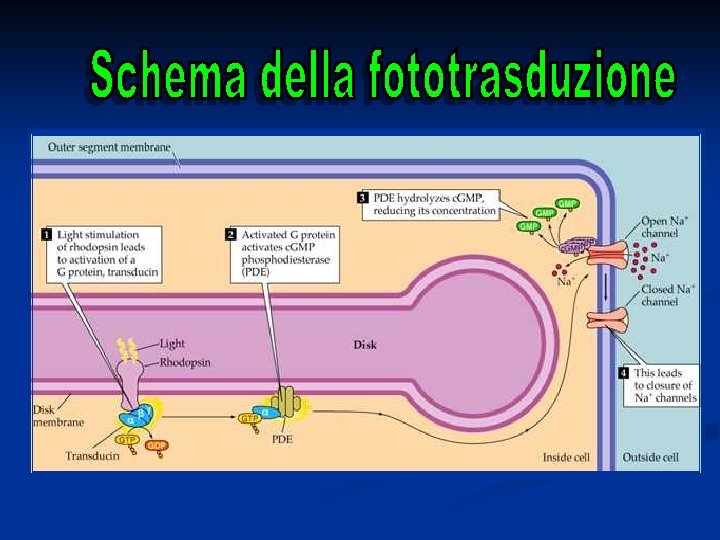 Fotone Un e- dell’ 11 -cis-retinale Transducina PDE. . . . . Transducina PDE Idrolisi di c-GMP . . Idrolisi di c-GMP Canale del Na+ . . Canale del Na+