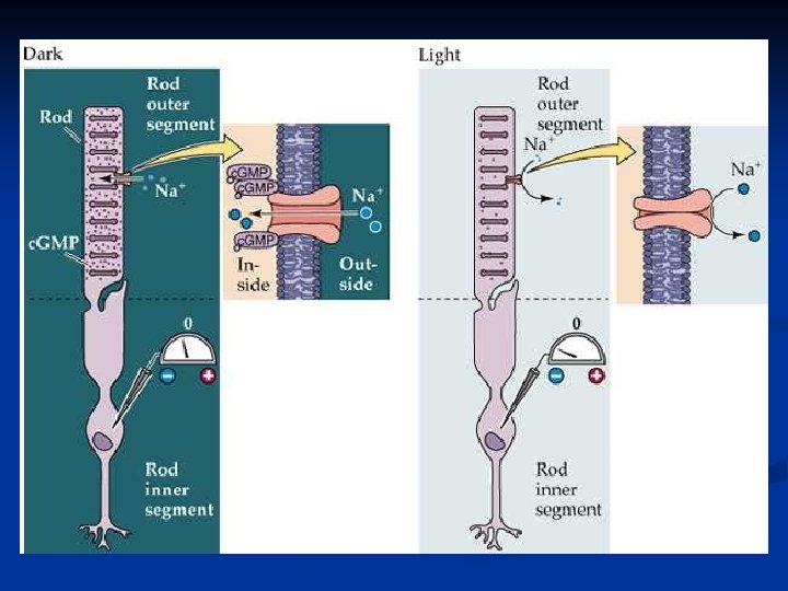Nel segmento interno ci sono i canali del K+ che, di solito, determinano il potenziale di riposo di membrana. I canali cationici mantenuti aperti dal c. GMP nel segmento esterno, tendono a spostare il potenziale di riposo verso valori meno negativi perché si stabilisce un equilibrio fra canali del K+ e canali cationici. Tanto che IL POTENZIALE DI RIPOSO DI UN FOTORECETTORE AL BUIO VALE CIRCA -40 m. V.
