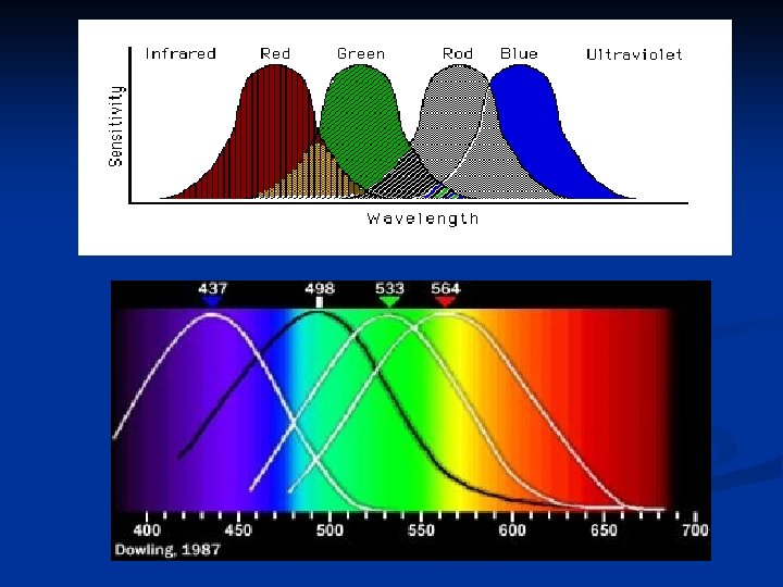 Questo meccanismo a cascata rende i bastoncelli particolarmente sensibili al buio. I coni sono circa 300 volte meno sensibili dei bastoncelli, ma i loro pigmenti funzionano in maniera simile. La differenza dei pigmenti visivi è nella parte proteica, cioè nelle opsine (fotopsine), mentre la parte del retinale è uguale. Esistono quindi tre diverse popolazioni di con tre diversi fotopigmenti che risultano sensibili al blu, al verde e al rosso con picchi di assorbanza a 445, 535 e 570 nm rispettivamente.