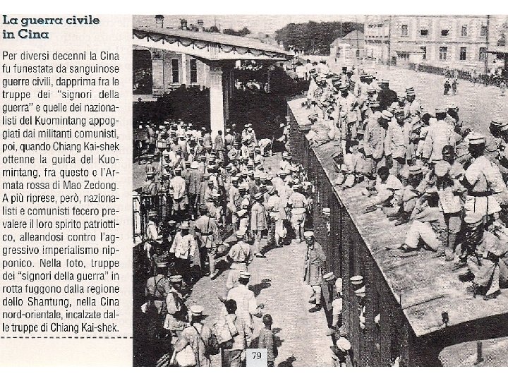 Nel 1937 In occasione dell’invasione giapponese si riavvicinarono, ma nel 1946 la lotta riprese Nel 1949 Chang Kai Shek fu costretto a ritirarsi coi resti del Kuomintang nell’isola di Formosa sotto la protezione americana Il 1 ottobre 1949 veniva proclamata la Repubblica popolare cinese