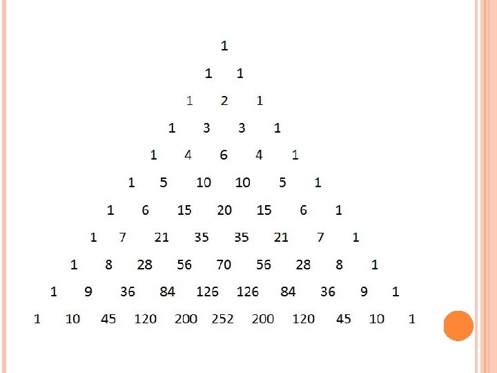 Il filosofo e matematico francese Blaise Pascal (16231662) utilizzò invece il triangolo per ricavare tutti gli abbinamenti possibili tra alcuni gruppi di numeri predefiniti. Se, per esempio, si vuole scoprire quante sono le strette di mano che si possono scambiare 2, 4 o 10 persone diverse, bisogna andare nella riga del 2 del triangolo e scorrere una delle due diagonali corrispondenti (sono uguali): accanto ai numeri ipotizzati, si trova il risultato: tra 2 persone è possibile una sola stretta di mano, tra 4 sono possibili 6 strette, tra 10 sono possibili 45 strette di mano.
