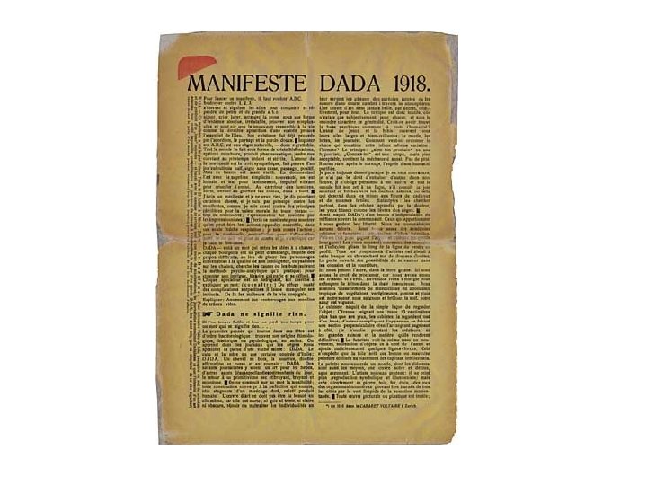Tristan Tzara, Manifesto Dada del 1918 pubblicato in “Dada”, n. 3, Zurigo 1918 • Dada non significa nulla • è una parola stampata per la prima volta nella raccolta del Cabaret Voltaire del 15. 6. 1916 • nella lingua africana kru significa ‘coda di vacca sacra’ • fu trovata a caso nel dizionario Petit Larousse Illustré • in rumeno e russo significa: sì, certo, è così. • in tedesco: ci vediamo, arrivederci • in italiano: la balia, la mamma, il dado • in francese: cavallo a dondolo, ma anche idea fissa • dada è il cuore delle parole, lallazione, ripetizione, nonsense e tautologia sonora