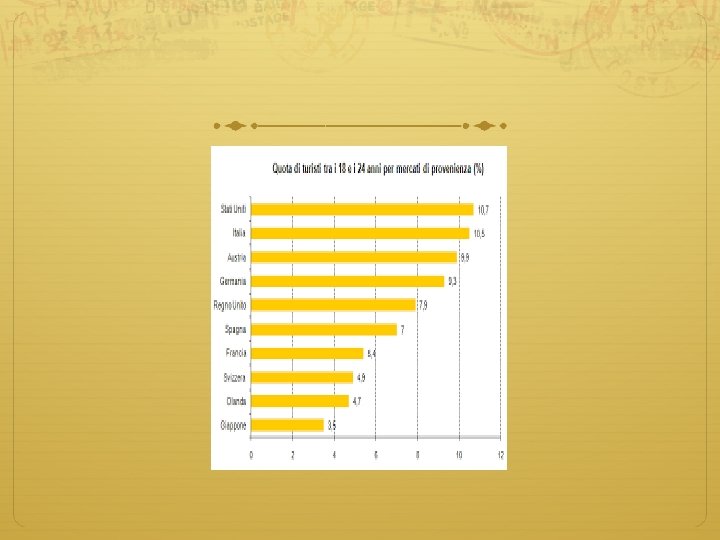 Le caratteristiche salienti Fra i 15 e 26 anni, svincolati da legami familiari; 18% del volume globale (200 milioni di persone); Europa, America Latina, Stati Uniti (aumento di viaggi a lungo raggio); Evoluzione qualitativa: il turismo dei valori.