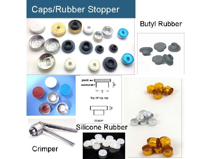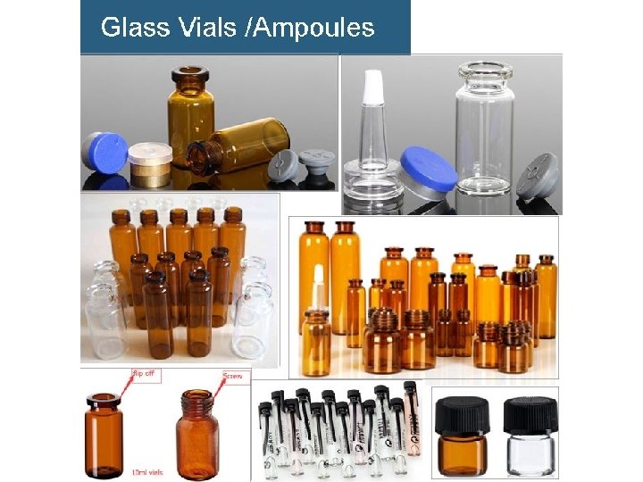 TIPI DI VETRO TIPO I: Vetro Borosilicato 80% Si. O 2 e 10% B 2 O 3 e piccoli quantitativi di Al 2 O 3 ed Na 2 O Per flaconi e fiale per prodotti per uso parenterale, inerte e con basso coefficiente di espansione termica TIPO II: Sodio calcico trattato E’ una forma dealcalinizzata del vetro sodio calcico con elevati livelli di Na 2 O e Ca. O La superficie può essere trattata con SO 2 per convertire gli ossidi in superficie in Sali che poi vengono allontanati lavando. coefficiente di espansione termica più elevato ed è usato per soluzioni con p. H≤ 7 TIPO III Sodio Calcico Solo per liquidi anidri e prodotti secchi, non usato per preparazioni parenterali, resistenza idrolitica moderata, solo per polveri per uso parenterale TIPO IV: Bassa resistenza idrolitica, solo per prodotti per uso topico od orale